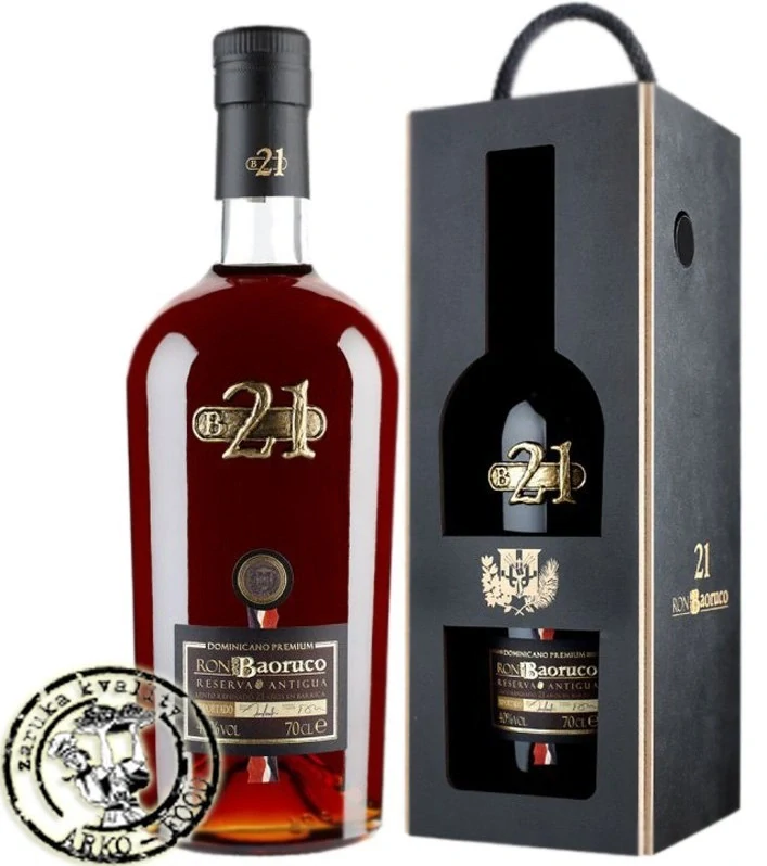 Baoruco 21 YO je vyjádřením čistoty a dominikánské tradice pomalého zrání těch nejvybranějších destilátů z cukrové třtiny. Jeho komplexní chuť a jedinečné aroma předčí očekávání i těch nejnáročnějších milovníků rumů, neboť je skutečným požitkem pro chuťové buňky. Elegantní láhev s kovovou číslovkou. Krásně se doplní s kvalitním doutníkem.