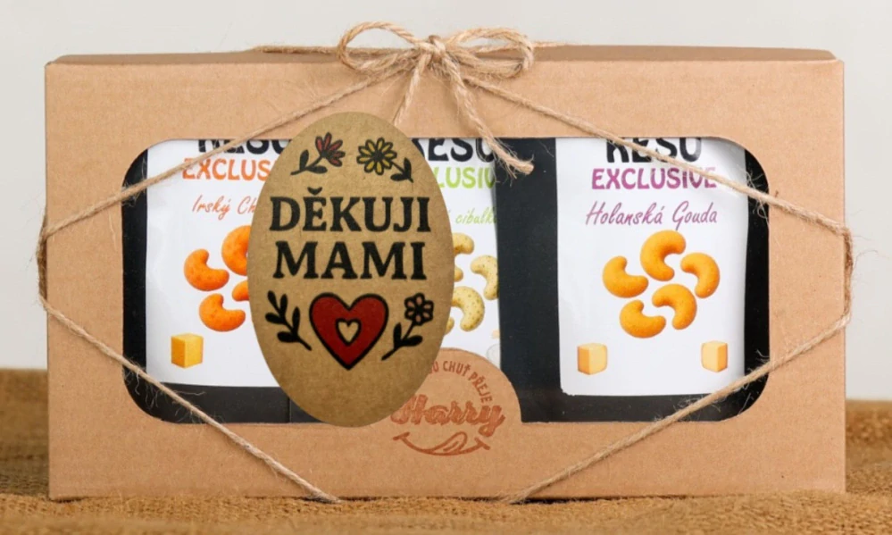 Dárková sada Kešu EXCLUSIVE mix Cheddar + Gouda + Smetanová cibulka Děkuji mamiSkladem > 5 ks179 Kč/ ks160 Kč bez DPH