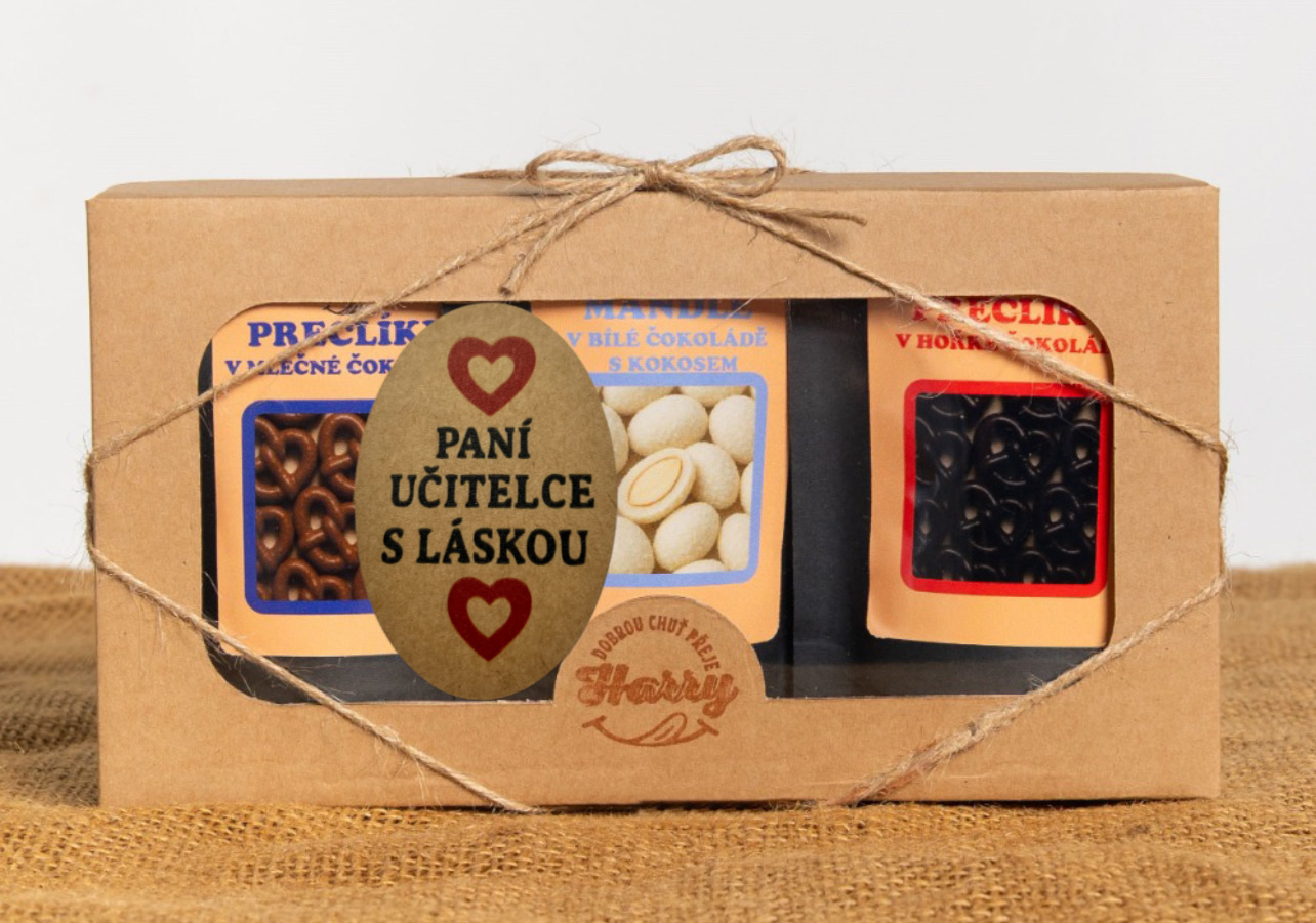 - Dárková sada křupavých preclíků a sladkých mandlí mix 3ks paní učitelce s láskou