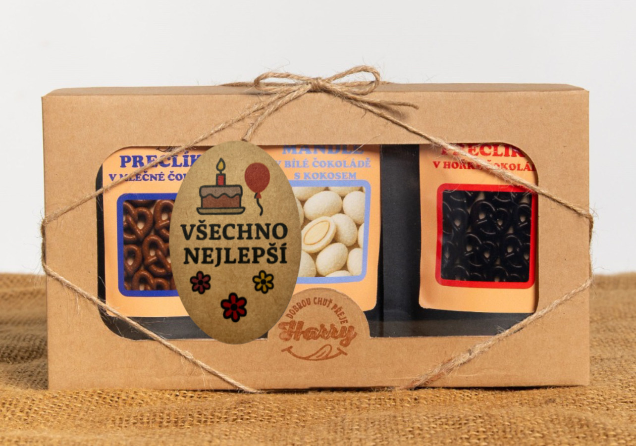 - Dárková sada křupavých preclíků a sladkých mandlí mix 3ks všechno nejlepší