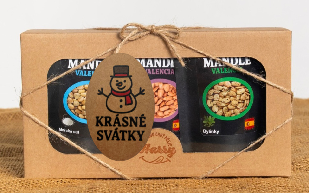 - Dárková sada Španělských mandlí bylinky+uzené+mořská sůl krásné svátky sněhulák