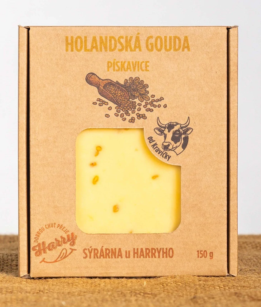 Kravský sýr s pískavicí je lahodná varianta tradiční holandské goudy s přidanou pískavicí, která sýru dodává jemnou oříškovou chuť připomínající vlašské ořechy. Pískavice, známá svou lehce sladkou chutí, skvěle ladí s krémovou texturou sýra a vytváří harmonický chuťový zážitek. Tento sýr je ideální k vychutnání s pivem nebo jako součást sýrového talíře, kde jeho unikátní chuť vynikne.