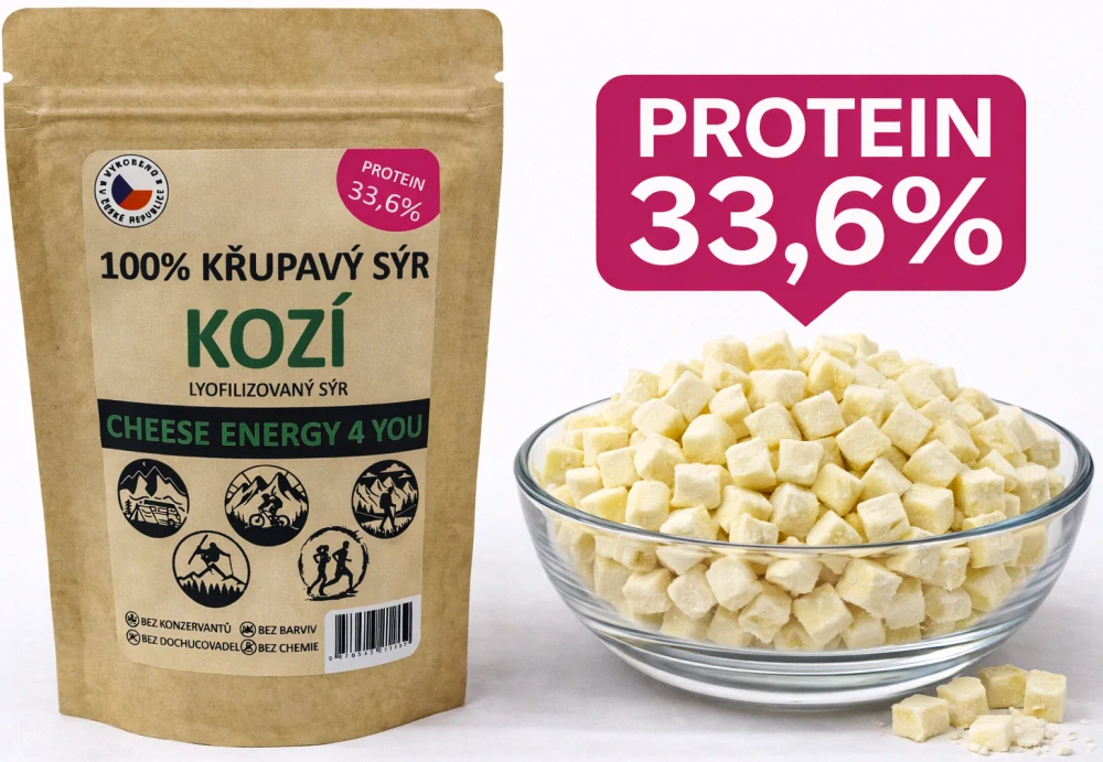 Kozí sýr CHEESE ENERGY 4 YOU 33,6% PROTEIN 50g Objevte Cheese Energy – lyofilizované sýry s vysokým obsahem proteinů. Křupavý, zdravý snack bez konzervantů, ideální na cesty i po tréninku. Kupujte u Harryho!“ V 50g balení najdete koncentrovanou sílu, která odpovídá cca 150g čerstvého sýra celý popis