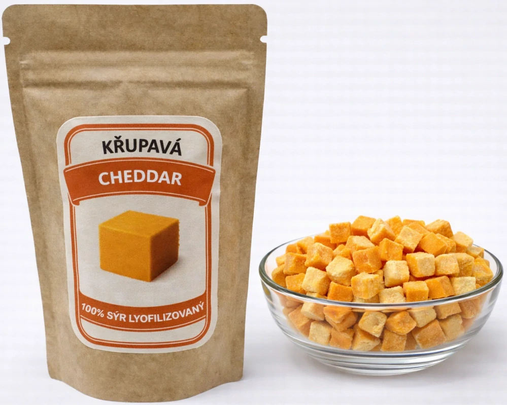 Milujete cheddar? Pak se připravte na chuťovou explozi. Náš lyofilizovaný cheddar prochází procesem sušení mrazem, při kterém se odpaří voda, ale zůstane vše ostatní: plná smetanová chuť, aroma a veškeré nutriční hodnoty. Výsledkem jsou lehoučké kousky, které v ústech nejdříve křupnou a pak se rozplynou na jazyku.
