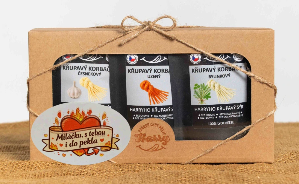 - Křupavý sýr Dárková sada 3 druhů lyo korbáčiků od Bači Miláčku s Tebou i do pekla Srdce