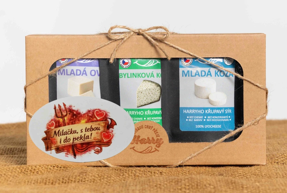 Křupavý sýr Dárková sada 3 druhů lyo sýrů nejen od kozičky Miláčku s Tebou i do pekla VidleSkladem > 5 ks199 Kč/ ks178 Kč bez DPH