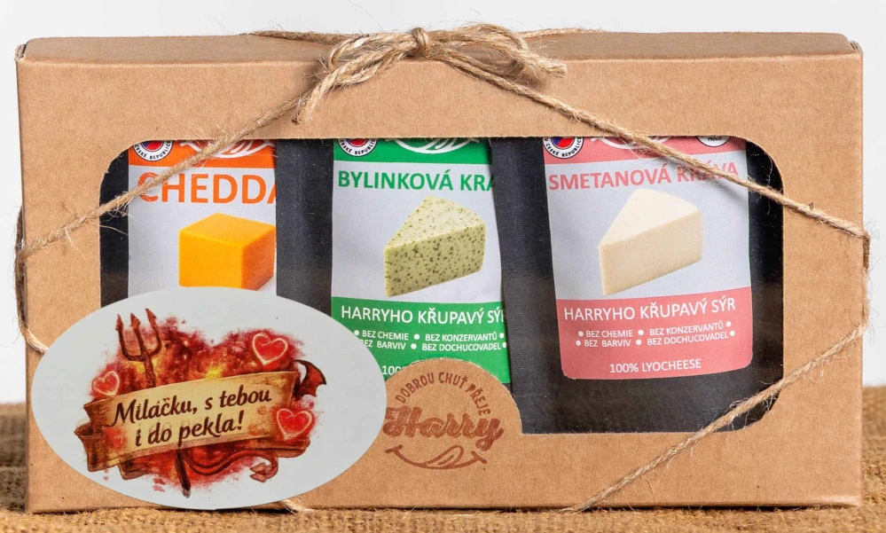 Křupavý sýr Dárková sada 3 druhů lyo sýrů od kravičky Miláčku s Tebou i do pekla VidleSkladem > 5 ks199 Kč/ ks178 Kč bez DPH